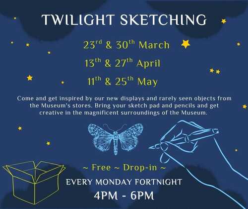 Twilight Sketching is back! Come and get inspired by our new displays and rarely seen objects from the Museum's stores. Bring your sketch pad and pencils and get creative in the magnificent surroundings of the Museum.
